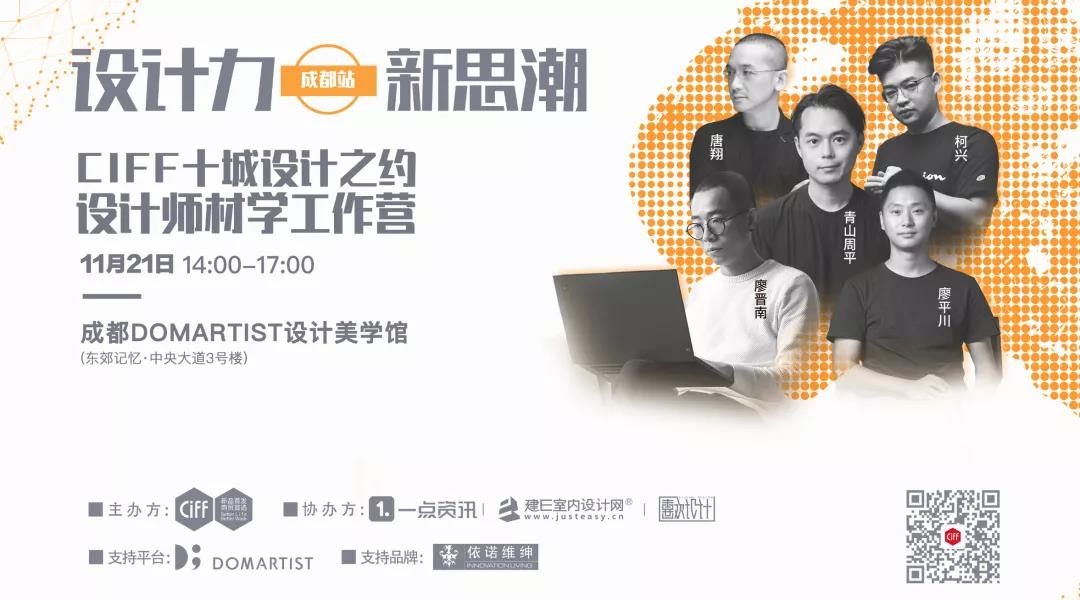 11月21日,“CIFF十城设计之约”继首秀南京后,第三站移师成都DOMARTIST设计美学馆。中国家博会联合一点资讯、建E室内设计网、喜欢设计开启“设计师材学工作营 · 成都站”。