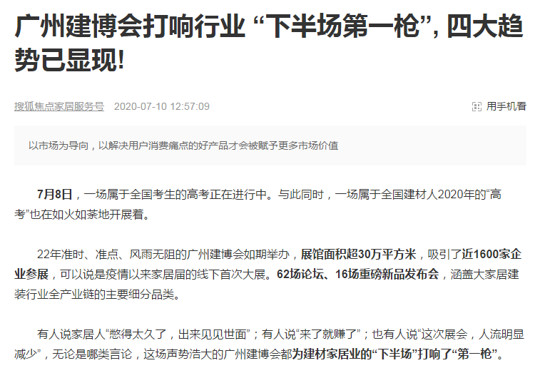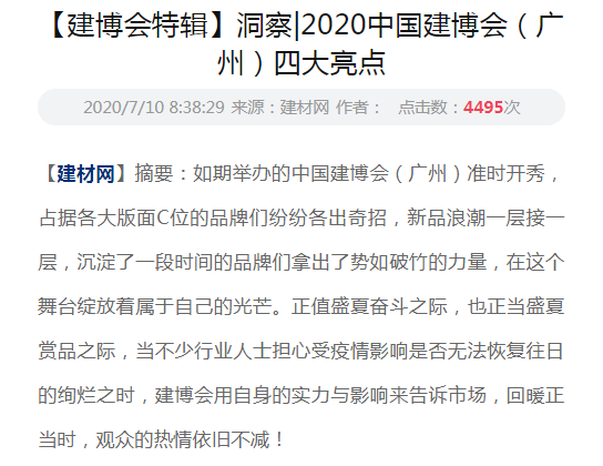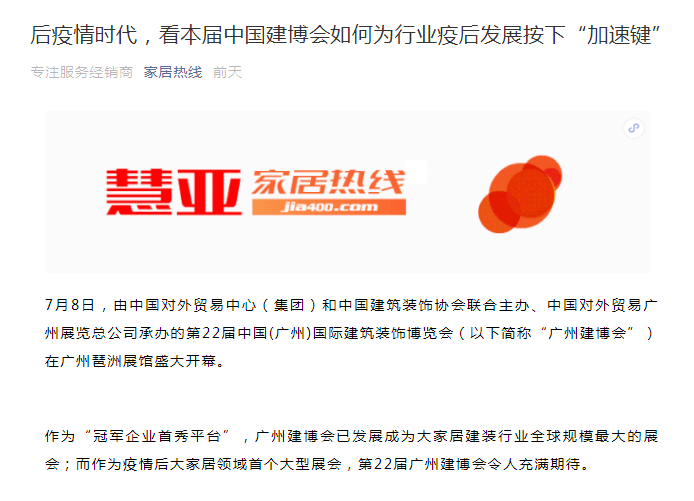 说明:有部分媒体仍沿用早年习惯,称中国建博会(广州)为广州建博会。为保持所引用媒体报道原貌,本文未对相关名称进行统一。