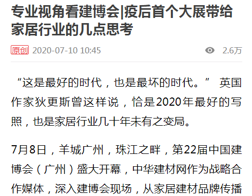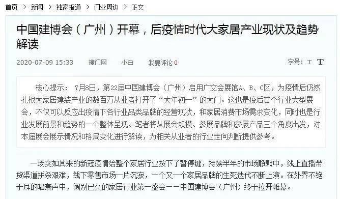 “第22届中国建博会(广州)启用广交会展馆A、B、C区,为疫情后仍然扎根大家居建装产业的数百万从业者打开了‘大年初一’的大门。这也是疫后首个行业大型展会,不仅可以反应出疫情下各行业品类品牌的经营现状,和家居消费市场需求变化,同时也是行业发展前景和趋势的一个整体呈现。”