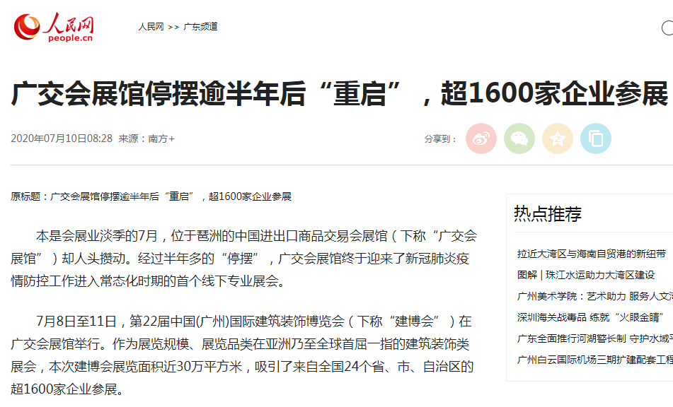 “第22届中国建博会今天在广州开幕,这是疫情防控以来,在广交会展馆首次的线下展会,共吸引近1600多家企业参展,主办方和参展企业都严格落实疫情防控措施。”