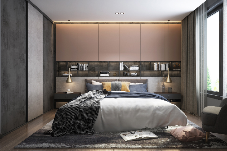 主卧衣柜采用一柜到顶的巧妙设计,大幅提高空间利用率;床头开放架可存放书籍、手机,背柜还能将换季物品统统藏起来,拯救鸡肋空间。