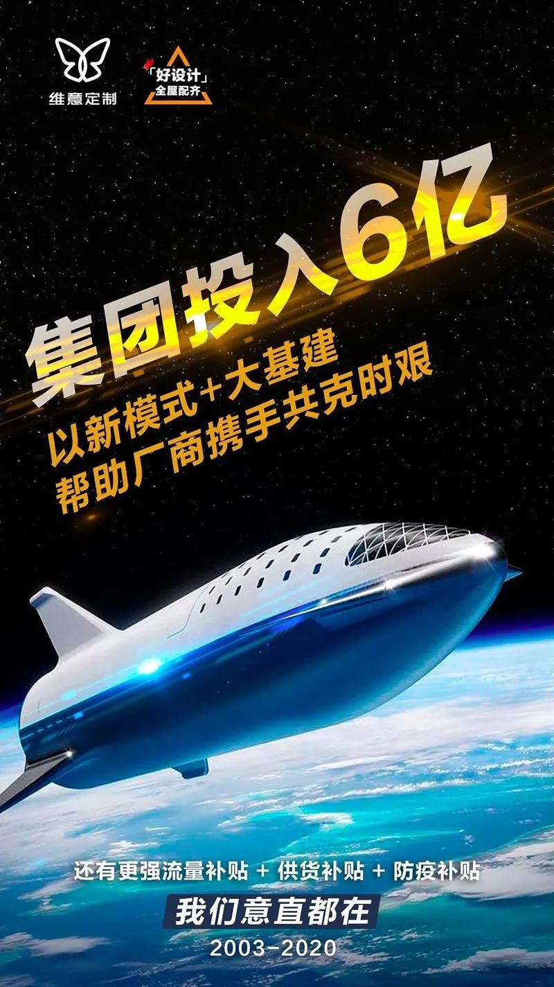 在春节前的集团年会上,维尚集团董事长李连柱与大家树立了新十年使命——“让中国人民美好家居生活的实现过程美好一点”。还特别强调了维意发展主张:坚持做有价值的事,坚持做有价值的品牌!在这个价值主张的指引下,在严重的疫情面前,2020年维意投入了6亿元,打造新模式,开展大基建,对社会、对行业、对消费大众做一件更加有价值的事。