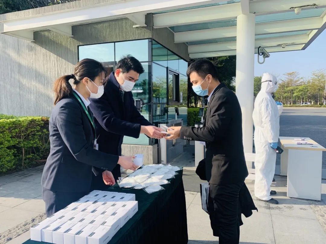 各中心、各厂区员工复工到岗时,行政部警卫使用红外热成像测温器及手持红外线测温仪对出入人员进行两关体温测量,提高检测准确度,确保复工安全。员工上班每日可领取2个防疫口罩;电梯内备有纸巾,供员工乘坐电梯时按键使用。