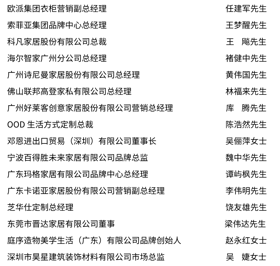 (从左到右:索菲亚集团品牌中心总经理王梦醒、海尔智家广州分公司总经理褚健中、中国设计品牌网总策划吴文粒、科凡定制总裁王飚、深圳市室内建筑设计行业协会会长于强、广州市商务局副局长罗政、中贸展总经理刘晓敏、派雅门窗董事长李钧洪、欧派集团衣柜营销副总经理任建军、皇派门窗董事长朱福庆)