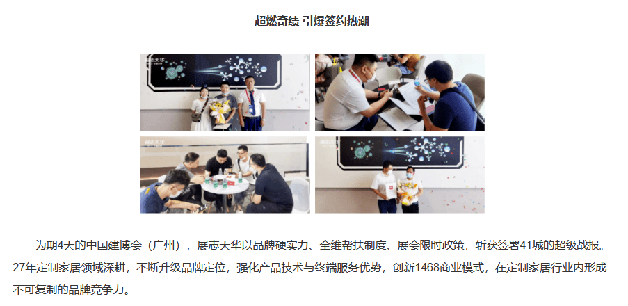 为期4天的中国建博会(广州),展志天华以品牌硬实力、全维帮扶制度、展会限时政策,斩获签署41城的超级战报。27年定制家居领域深耕,不断升级品牌定位,强化产品技术与终端服务优势,创新1468商业模式,在定制家居行业内形成不可复制的品牌竞争力。