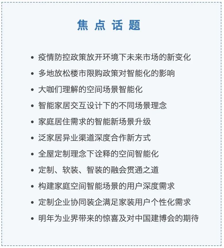 随着云计算、物联网等技术的快速发展,智能化空间正在逐渐走入普通人的生活,带给人们安全、便捷、舒适的生活方式。全屋化、生态化、智能化将成为未来居住空间的发展方向。目前全屋智能企业快速发展,传统定制家居也在不断推进智能化转型,大家居建装行业两大领域融合趋势明显,即将掀起一波泛智能融合的新浪潮。顺应行业发展趋势,12月28日,中国建博会将联合CSHIA特别举办“2023:寻找确定的力量——空间智能化系列高峰论坛 全场景智能化专场”,邀约智能与定制两大行业知名企业家华为终端BG首席战略官全屋智能产品线总裁邵洋、摩根全屋智能战略负责人胡先华、顶固营销总经理但咸熙、好莱客营销中心总经理库腾参与本次论坛对话,本次对话由CSHIA秘书长周军主持,将分别从智能家居与全屋定制视角,全面解析空间场景智能化发展趋势,关注新趋势下的异业渠道合作新形式,共同探讨智能与定制两大领域融合发展新路径。